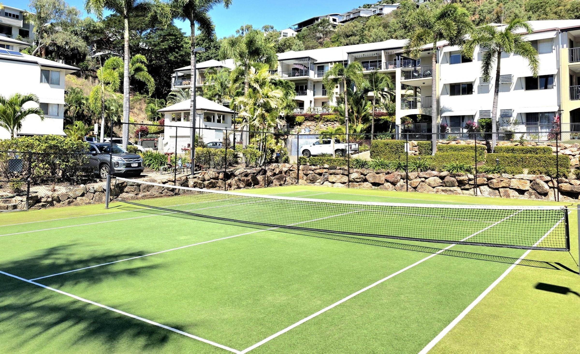 10. Resort-style facilities including a waterfall inground pool with tropical gardens, synthetic grass tennis court, and a dedicated managers’ office and workshop.