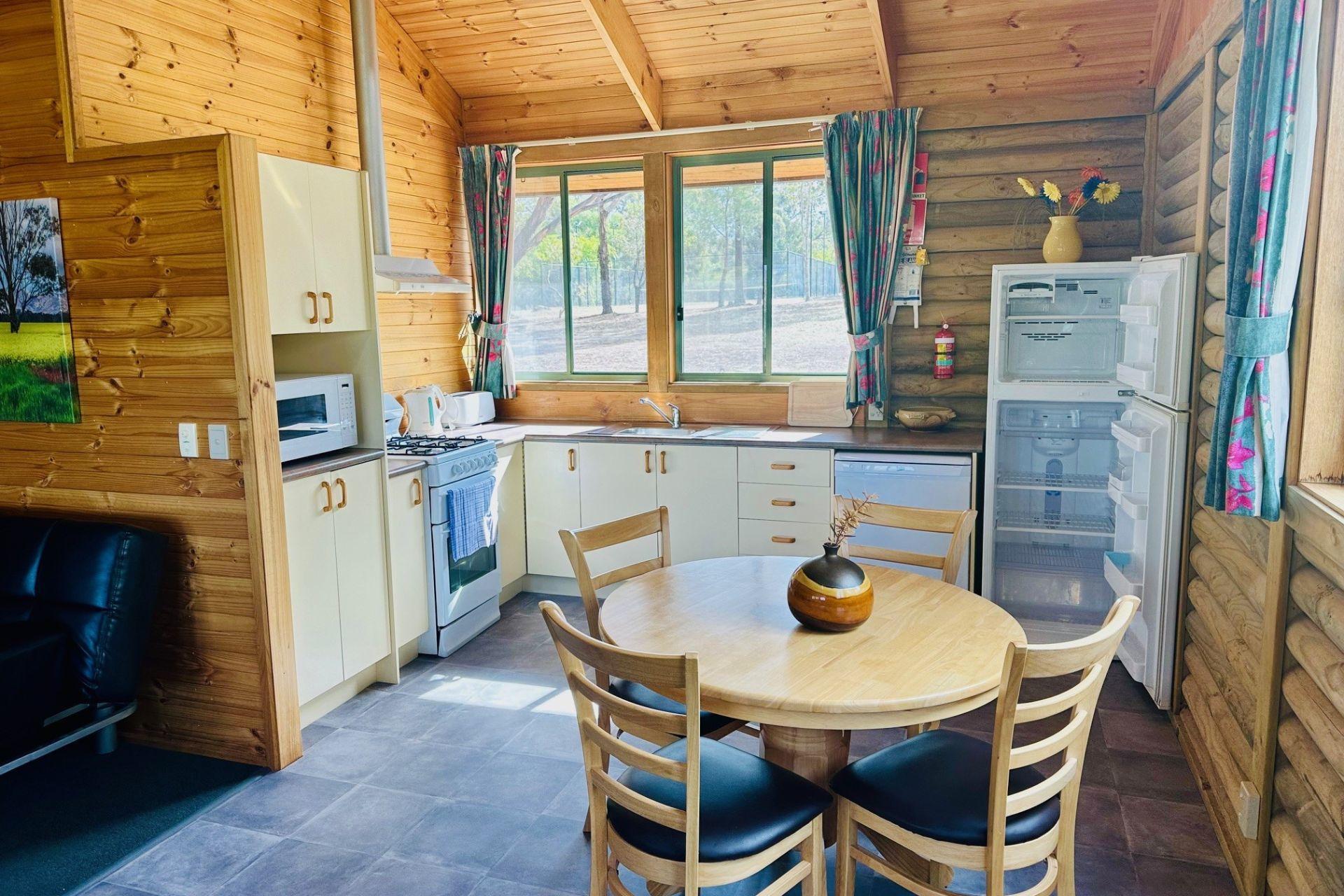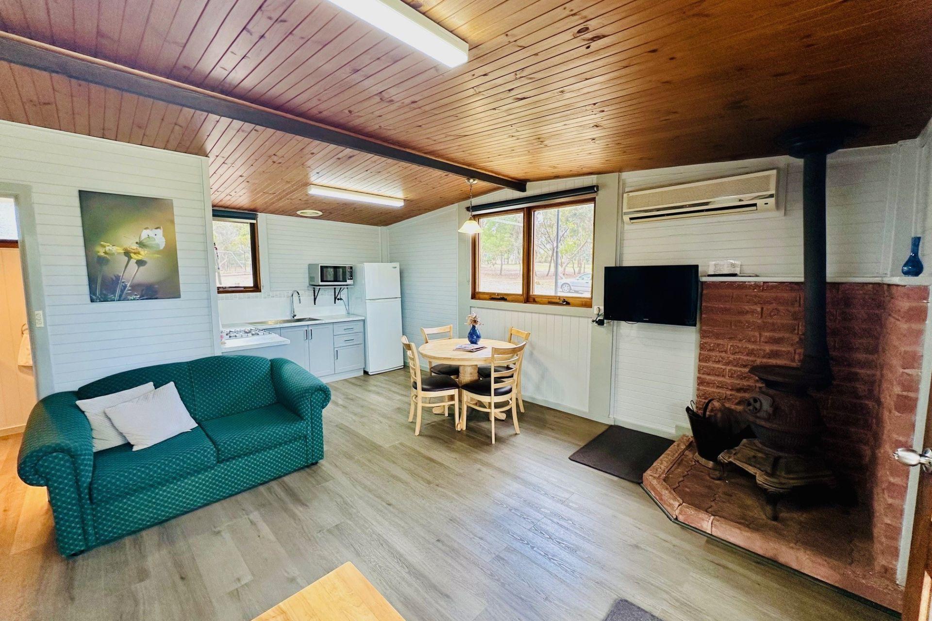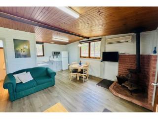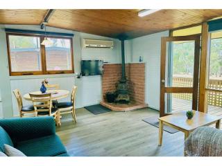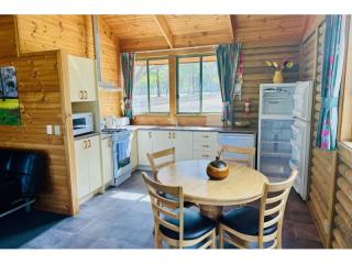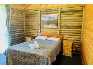 The resort provides a diverse range of accommodation options including executive log cabins, motel-style log flats, on-site cabin vans and caravans, as well as spacious camping areas catering to guests travelling with their own tents, caravans, campervans or swags across both powered and unpowered sites.