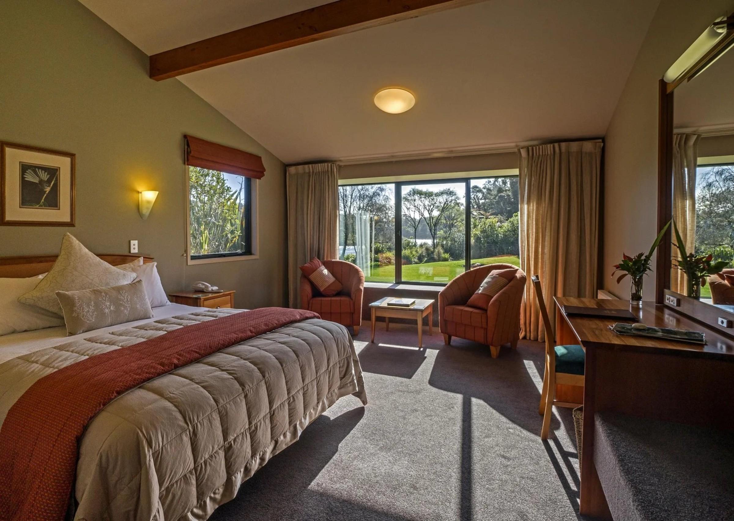 3. 28-room lodge with premium fitout, contemporary styling and quality materials, positioned beside river rapids or native garden and forest outlooks.